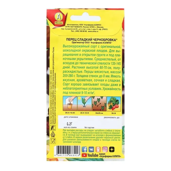 Высокоурожайный среднеспелый сорт с оригинальной, шоколадной окраской плодов. Предназначен для выращивания в открытом грунте и под пленочными укрытиями. Период от всходов до технической спелости 135-145 дней. Растения высотой 80-120 см, раскидистые. Перцы кубовидные, мясистые, гладкие, массой 150-220 г, толщина стенок 8-10 мм. Мякоть вкусная, ароматная, сочная и сладкая. Рекомендуется для свежего потребления и домашней кулинарии. Сорт хорошо завязывает плоды даже в неблагоприятных условиях.Посев. Выращивают рассадным способом. Рассаду высаживают в возрасте 60-70 дней, размещая на 1 м2 3-4 растения. В теплице сорт выращивают на шпалере с формированием в 2 стебля. Растениям необходимы регулярные поливы, прополки, рыхления и подкормки.