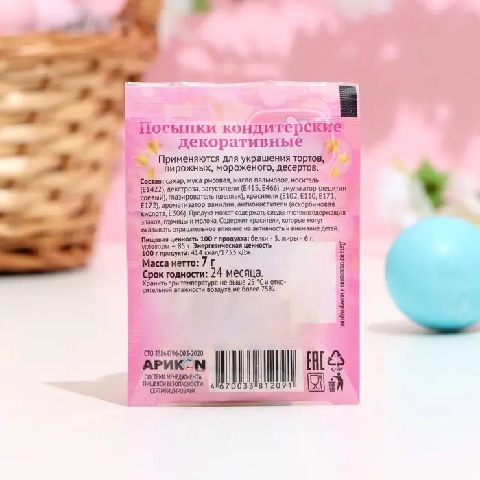 Состав: сахар, мука пшеничная, мука рисовая, масло пальмовое, крахмал кукурузный, вода питьевая, клетчатка соевая, декстроза, загустители (мальтодекстрин, ксантановая камедь), эмульгатор (лецитин), глазирователь (шеллак), красители пищевые (Е171, Е122, Е124, Е133, Е102, Е110, Е120, Е132), ароматизатор ванилин. Продукт может содержать следы молока и горчицы. Кондитерские посыпки содержат красители, которые могут оказывать отрицательное влияние на активность и внимание детей.