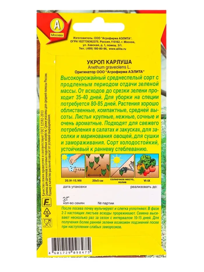 Семена Укроп Карлуша Ор. А, Ц/П,3 г