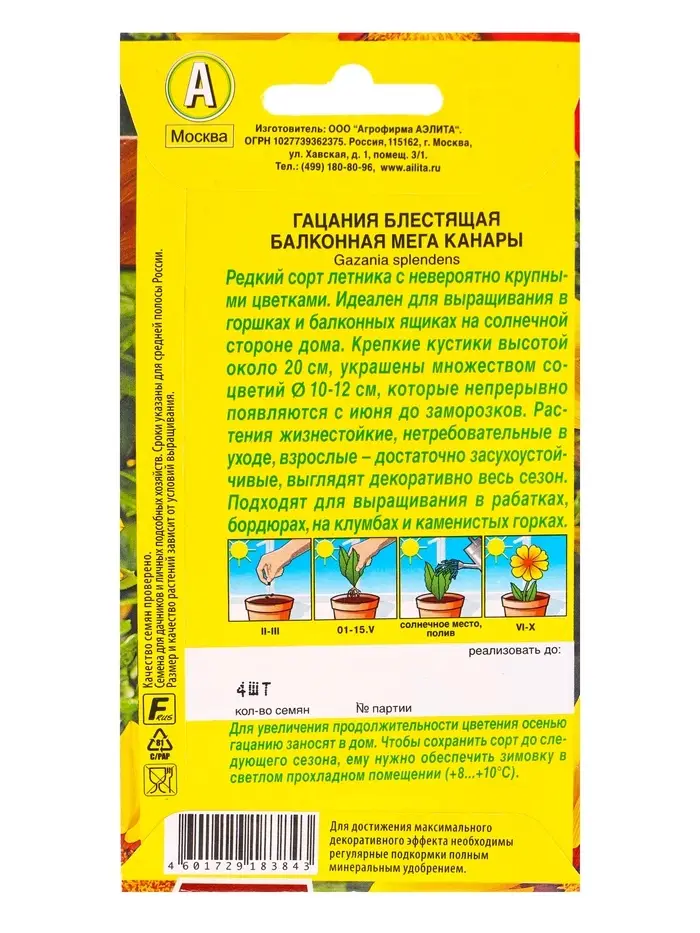 Семена цветов Гацания Балконная мега канары Цветущий балкон, Ц/П,4 шт.