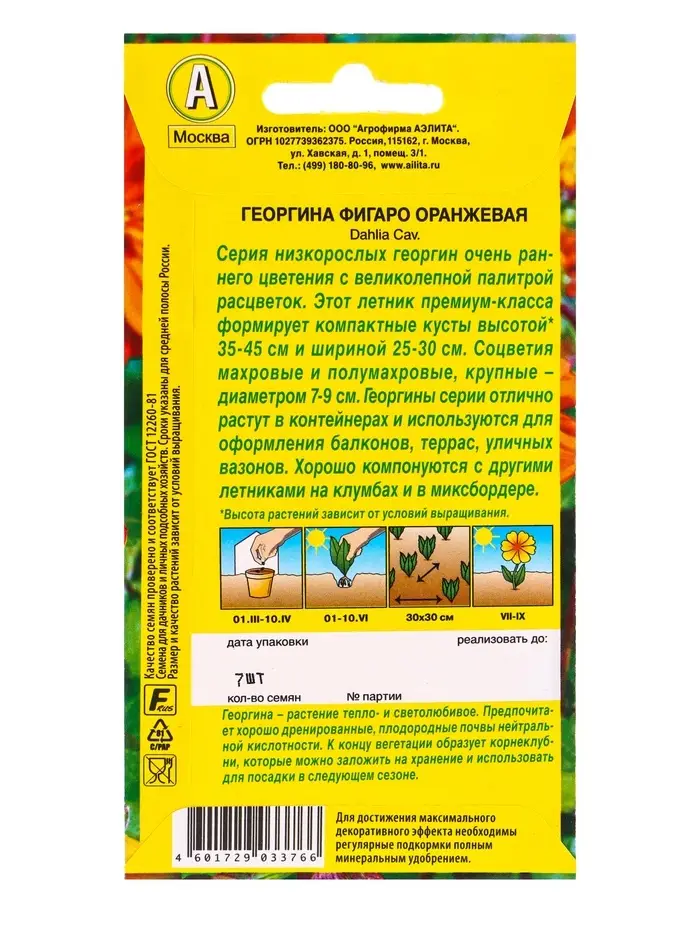 Семена цветов Георгина Фигаро махровая оранжевая , Ц/П,7 шт.