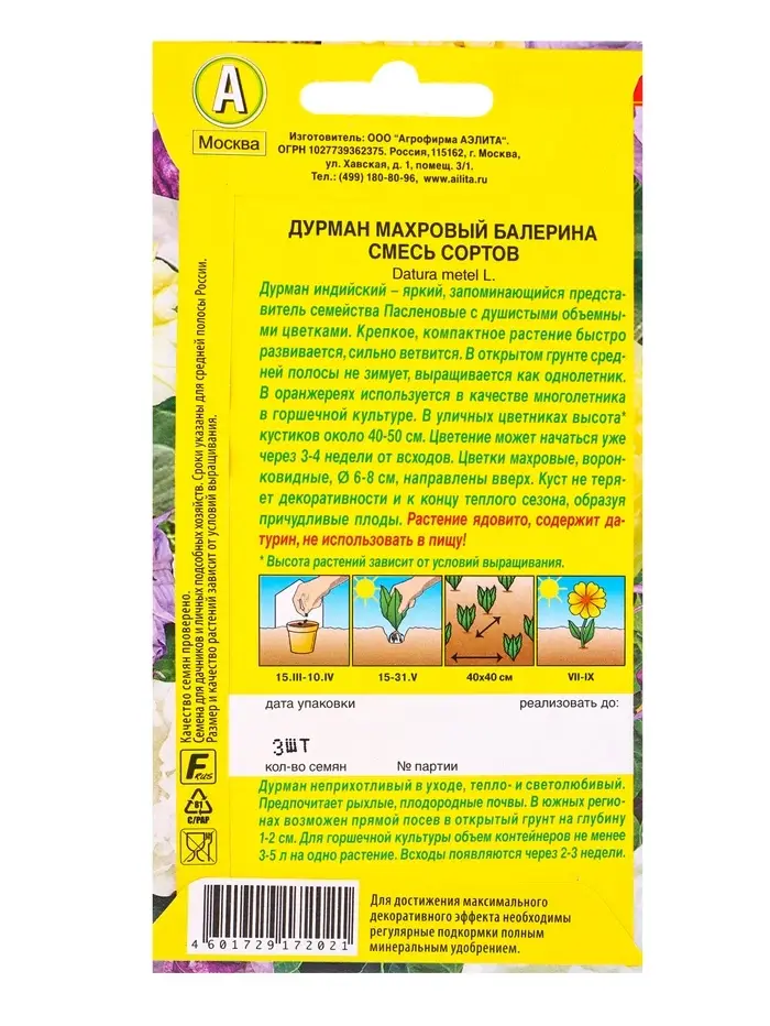 Семена цветов Дурман махровый Балерина, смесь сортов , Ц/П,3 шт.