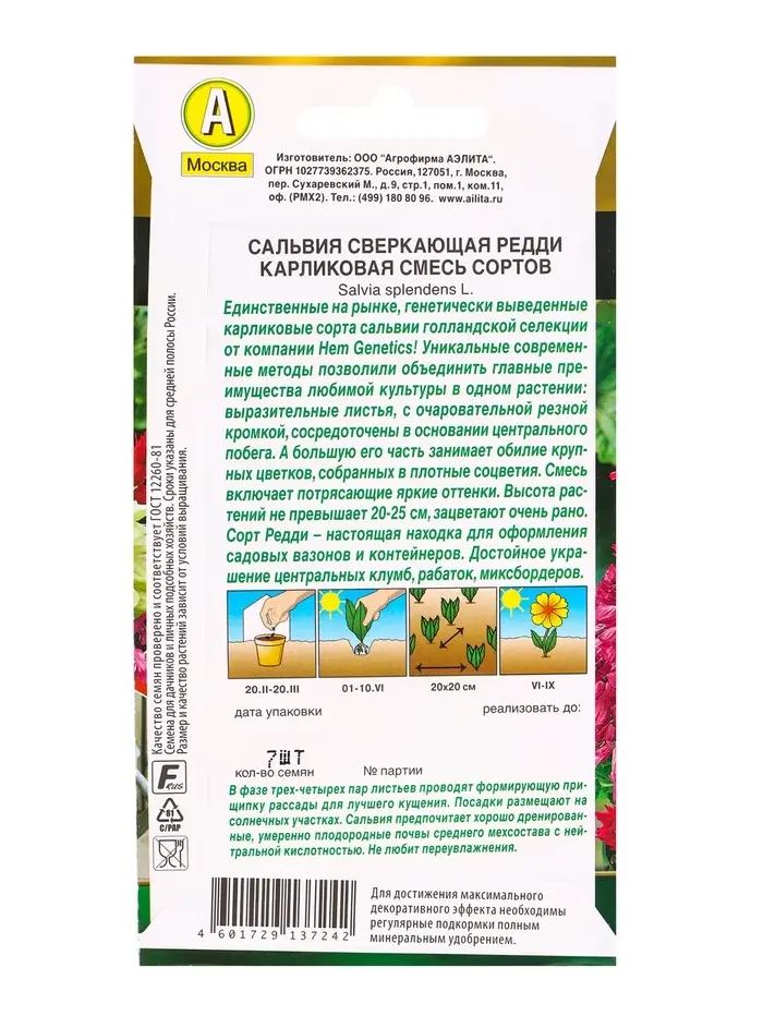 Семена цветов Сальвия Редди карликовая, смесь сортов С. Hem Genetics Золотая серия, Ц/П,7 шт. 10945