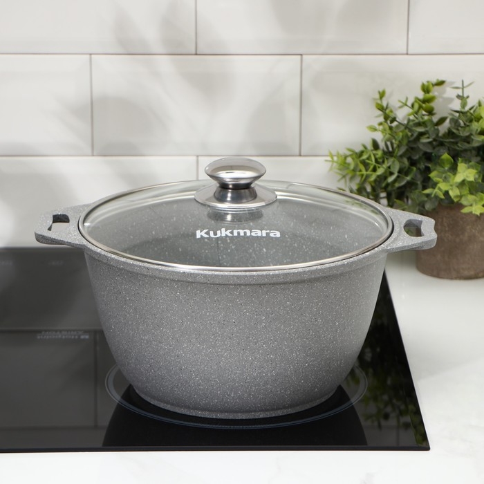 Кастрюля Kukmara сделана из литого алюминия. Имеет инновационное антипригарное мраморное покрытие на водной основе, которое изготовлено по немецкой технологии (Weilburger Coatings GmbH) и усилено сверхтвёрдыми частицами минералов.