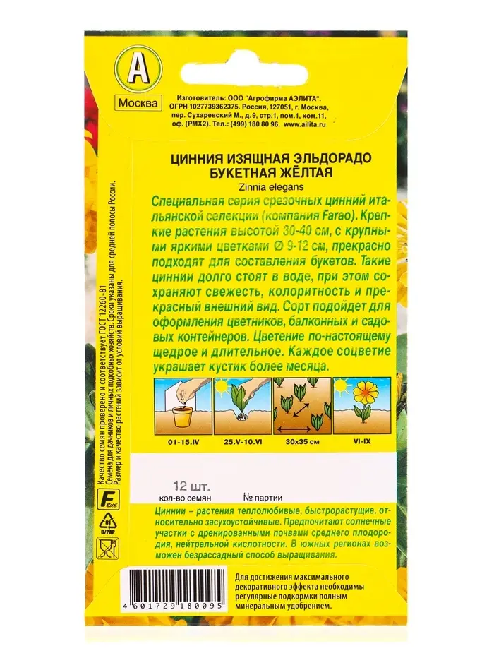 Семена цветов Цинния Эльдорадо букетная желтая С. Farao, Ц/П,12 шт.