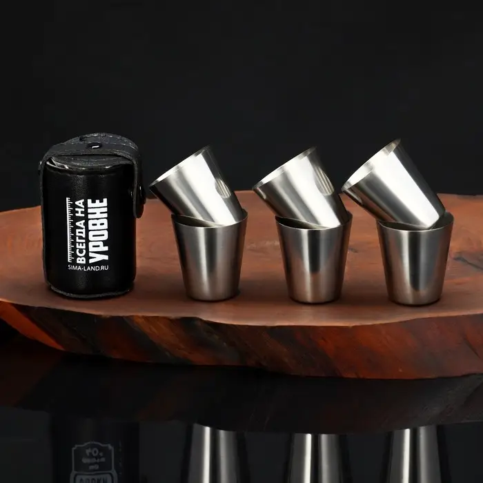 - Высокое качество материалов: стопки изготовлены из прочной нержавеющей стали, а чехол — из долговечного кожзаменителя.