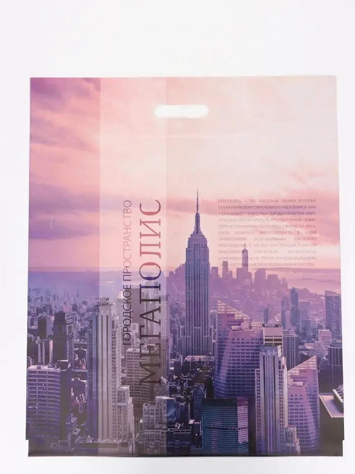 Упаковка с футуристичным дизайном Пакет «Пространство» сочетает сиреневый фон с графикой городских ландшафтов. Крупный формат и плотный полиэтилен подходят для презентации современных подарков.
