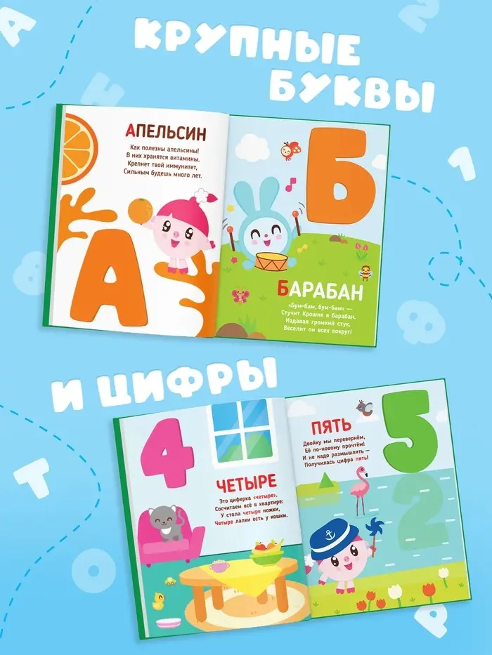 - Любимые персонажи из мультсериала «Малышарики» создают тёплую и знакомую атмосферу, которая мотивирует к обучению.