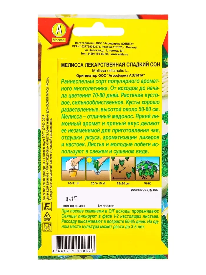 Семена Мелисса лекарственная Сладкий сон Ор. А, Ц/П,0,1 г