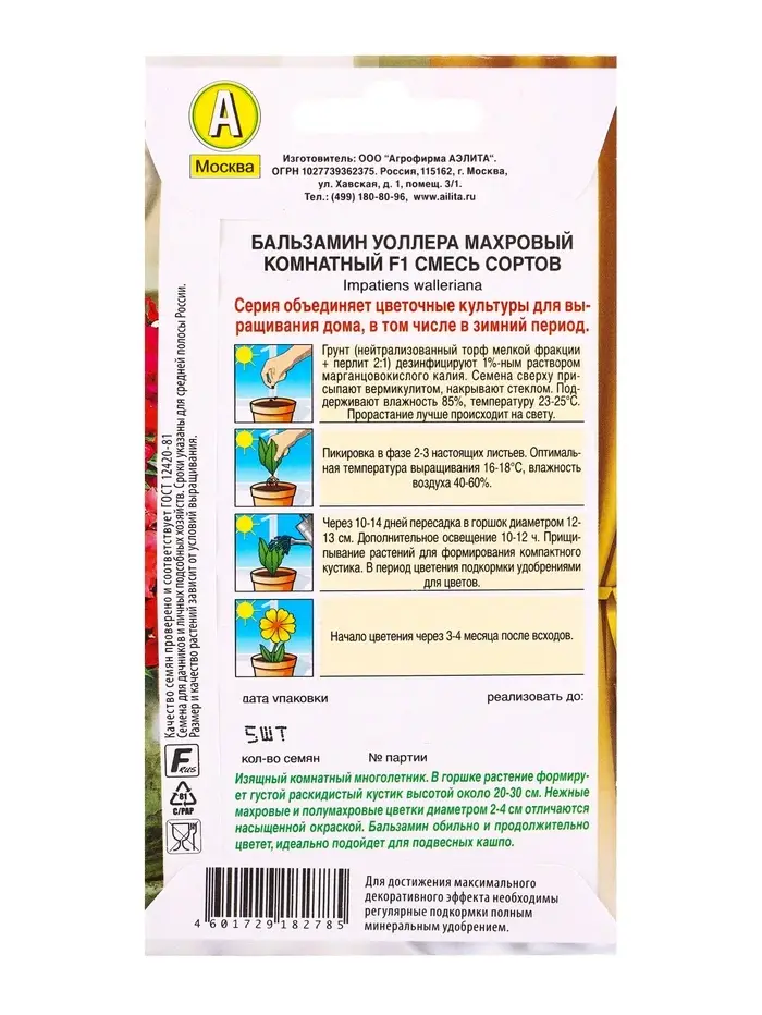 Семена цветов Бальзамин Махровый комнатный F1, смесь сортов Зимний сад, Ц/П,5 шт.