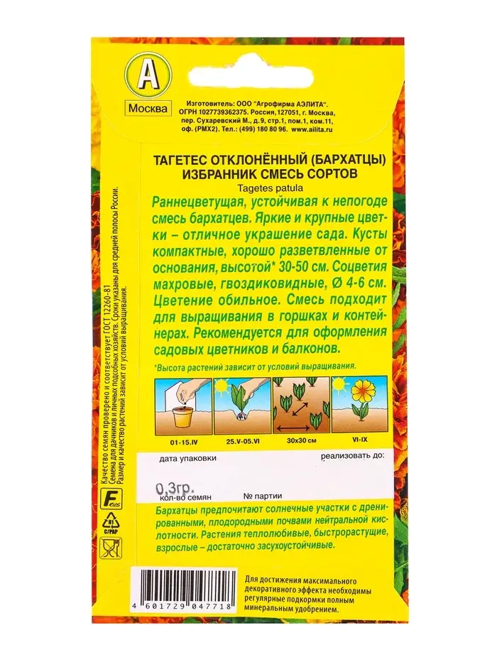 Семена цветов Бархатцы Избранник отклоненные, смесь сортов , Ц/П,0,3 г