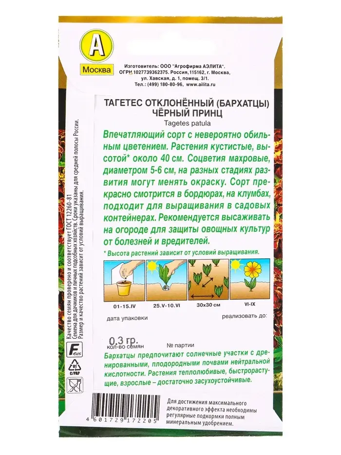 Семена цветов Бархатцы Черный принц отклоненные Золотая серия, Ц/П,0,3 г