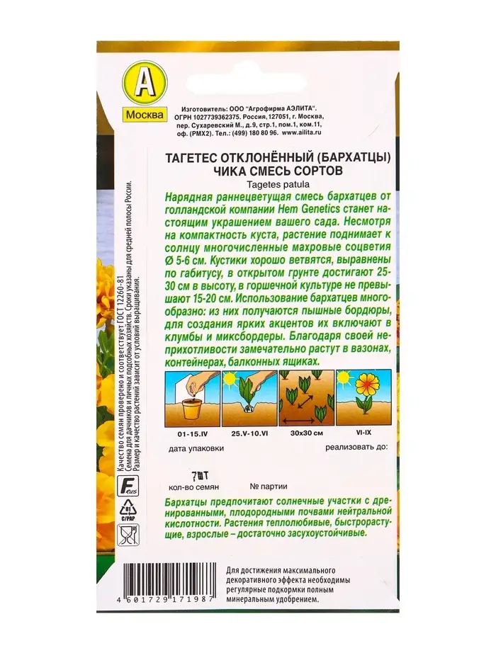 Семена цветов Бархатцы Чика отклоненные, смесь сортов С. Hem Genetics Золотая серия, Ц/П,7 шт. 1094