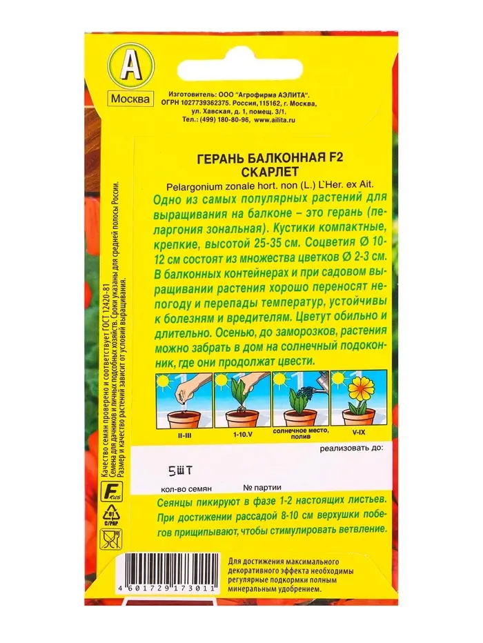 Семена цветов Герань Балконная скарлет F2 Мн Цветущий балкон, Ц/П,5 шт.
