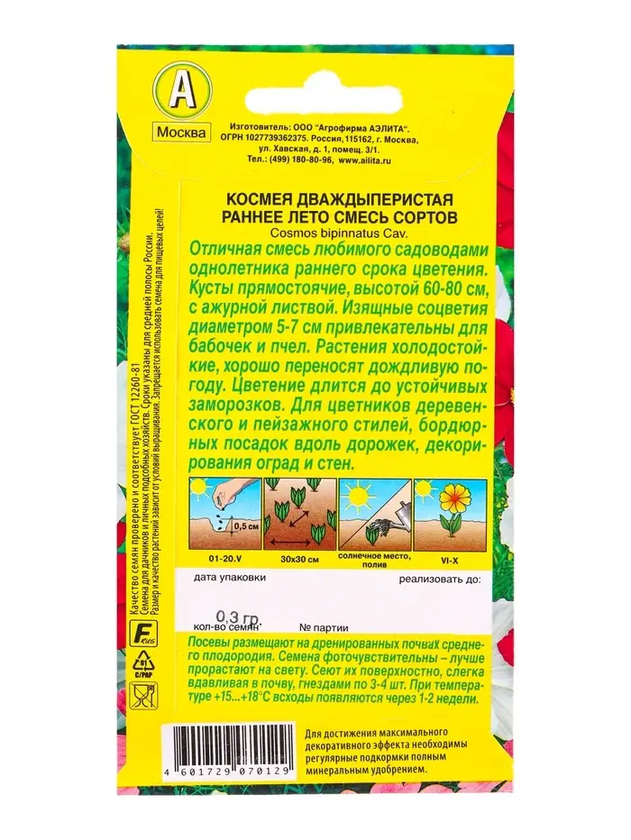 Семена цветов Космея Раннее лето, смесь сортов , Ц/П,0,3 г