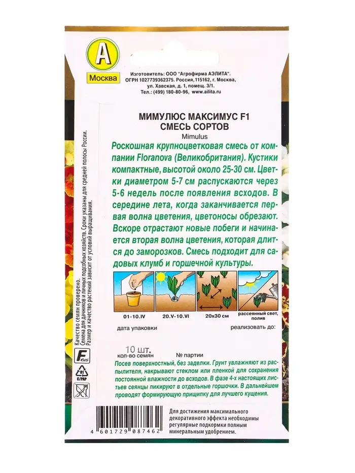 Семена цветов Мимулюс гибридный Максимус F1, смесь сортов С. Floranova , Ц/П,10 шт.