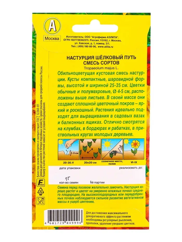 Семена цветов Настурция махровая Шелковый путь, смесь сортов , Ц/П,1 г