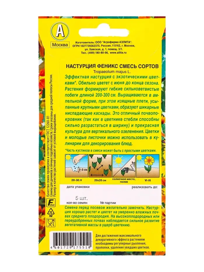 Семена цветов Настурция Феникс, смесь сортов , Ц/П,5 шт.