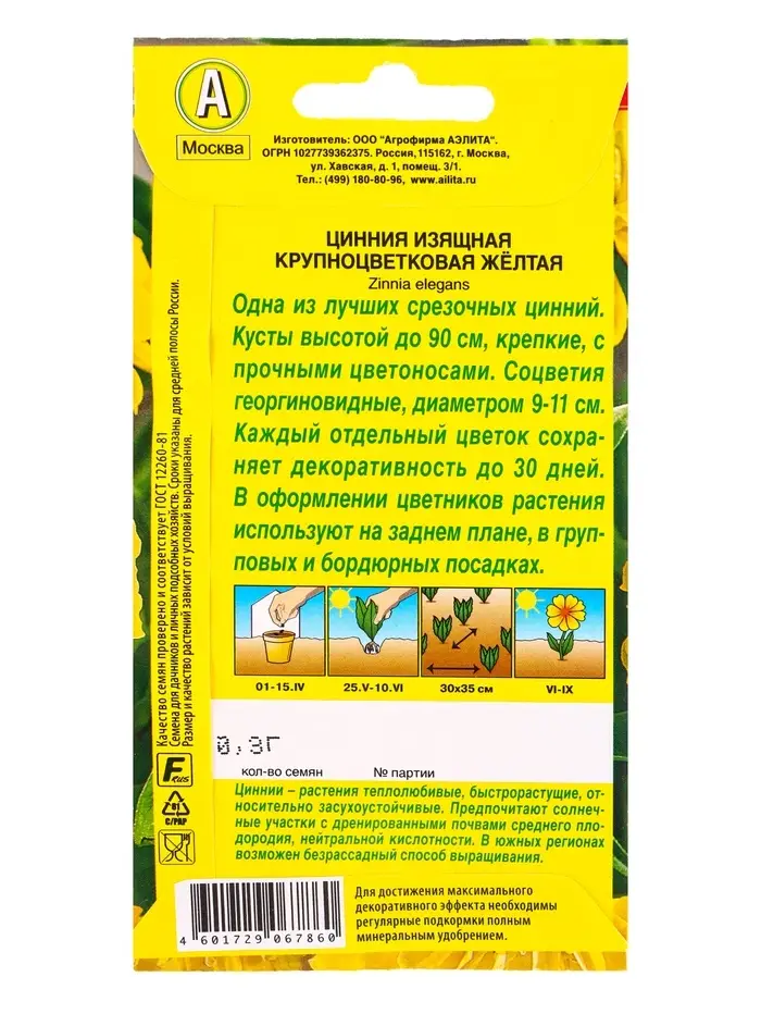 Семена цветов Цинния Крупноцветковая желтая , Ц/П,0,3 г