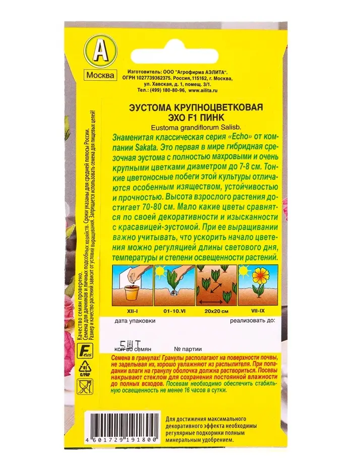 Семена цветов Эустома Эхо F1 пинк крупноцветковая (драже в пробирке) С. Sakata, Ц/П,5 шт.