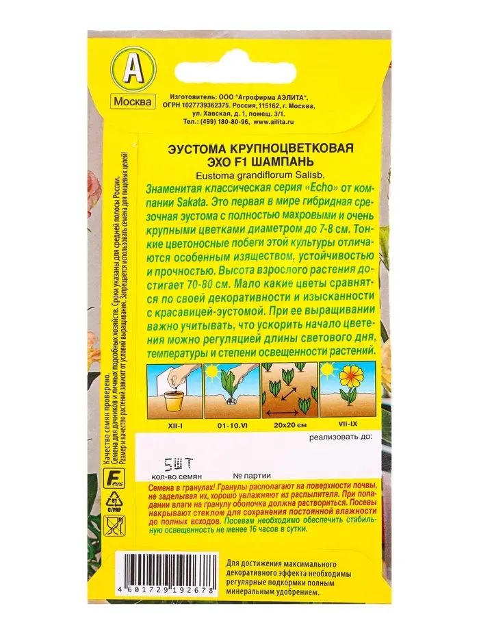 Семена цветов Эустома Эхо F1 шампань крупноцветковая (драже в пробирке) С. Sakata, Ц/П,5 шт. 109459