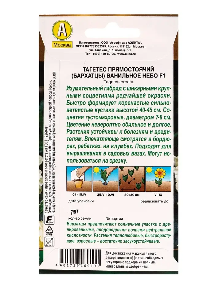 Семена цветов Бархатцы Ванильное небо F1 махровые Золотая серия, Ц/П,7 шт.