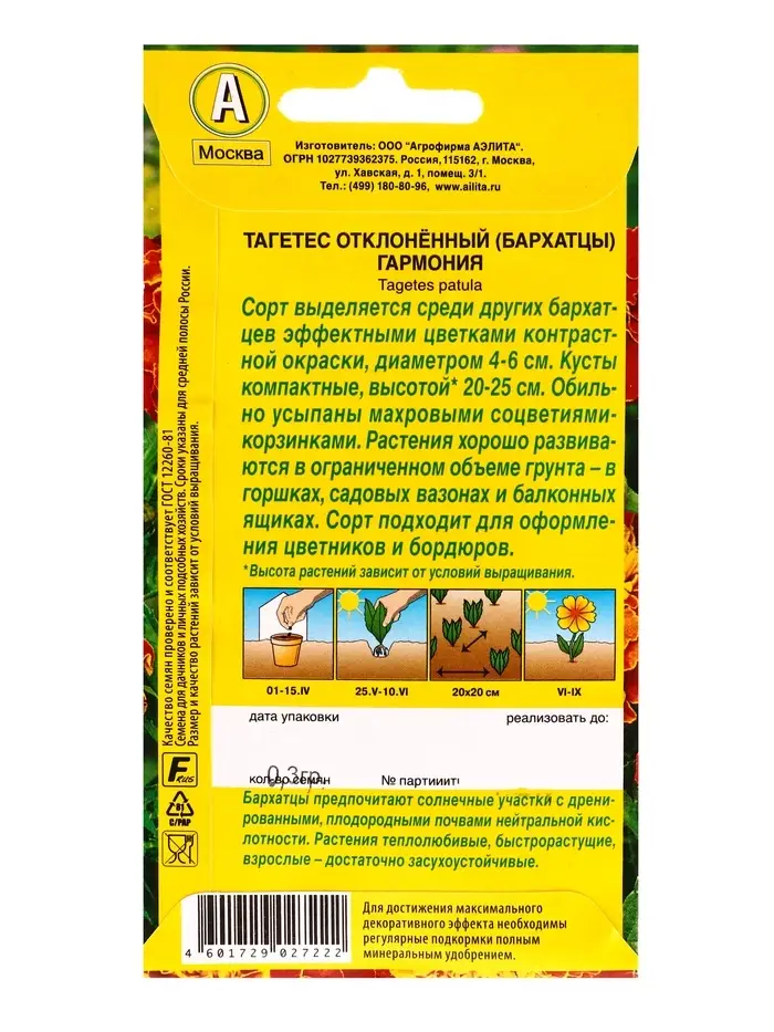 Семена цветов Бархатцы Гармония отклоненные , Ц/П,0,3 г