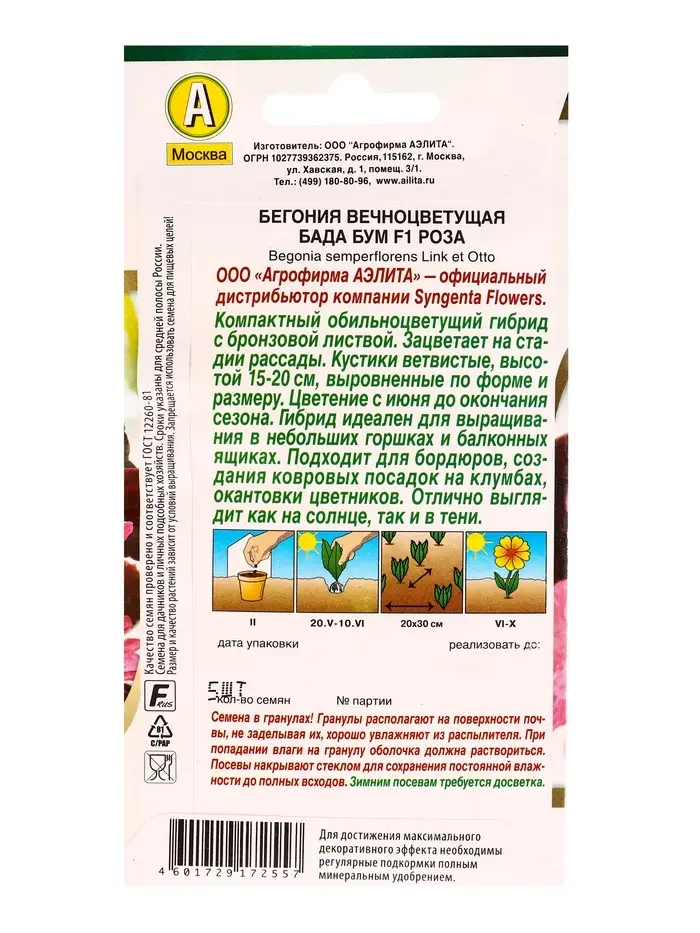 Семена цветов Бегония Бада бум F1 роза (драже в пробирке) Спецсерия Syngenta, Ц/П,5 шт.