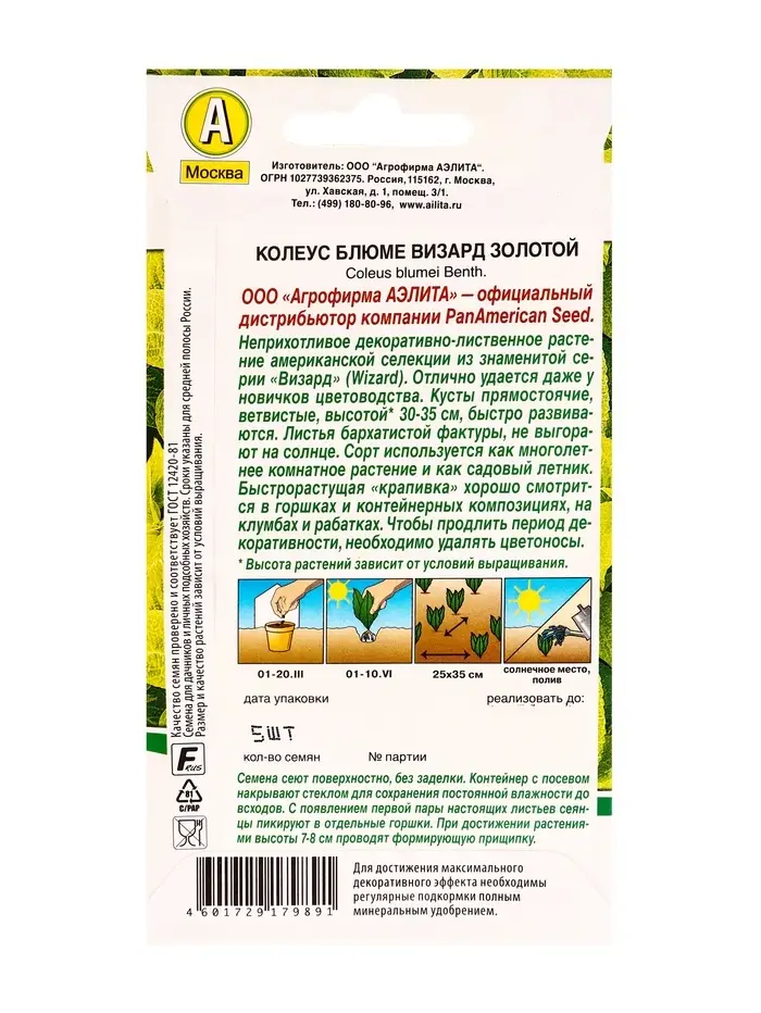 Семена цветов Колеус блюме Золотой Мн Спецсерия PanAmerican, Ц/П,5 шт.