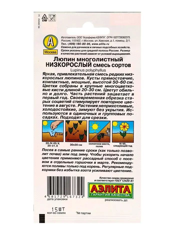 Семена цветов Люпин Низкорослый, смесь сортов Мн, Ц/П,15 шт.