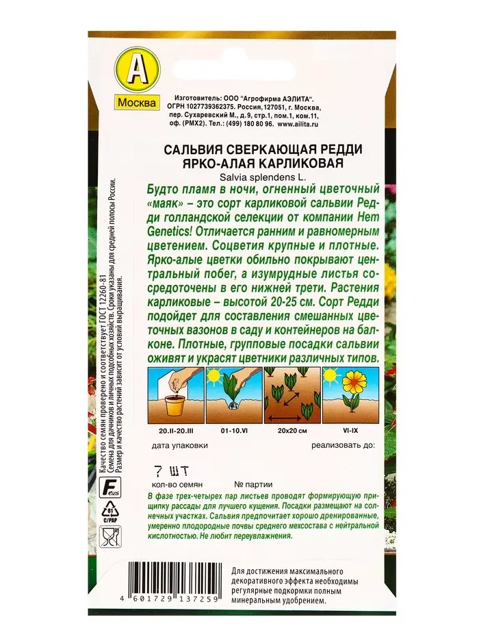 Семена цветов Сальвия Редди ярко-алая карликовая С. Hem Genetics Золотая серия, Ц/П,7 шт.