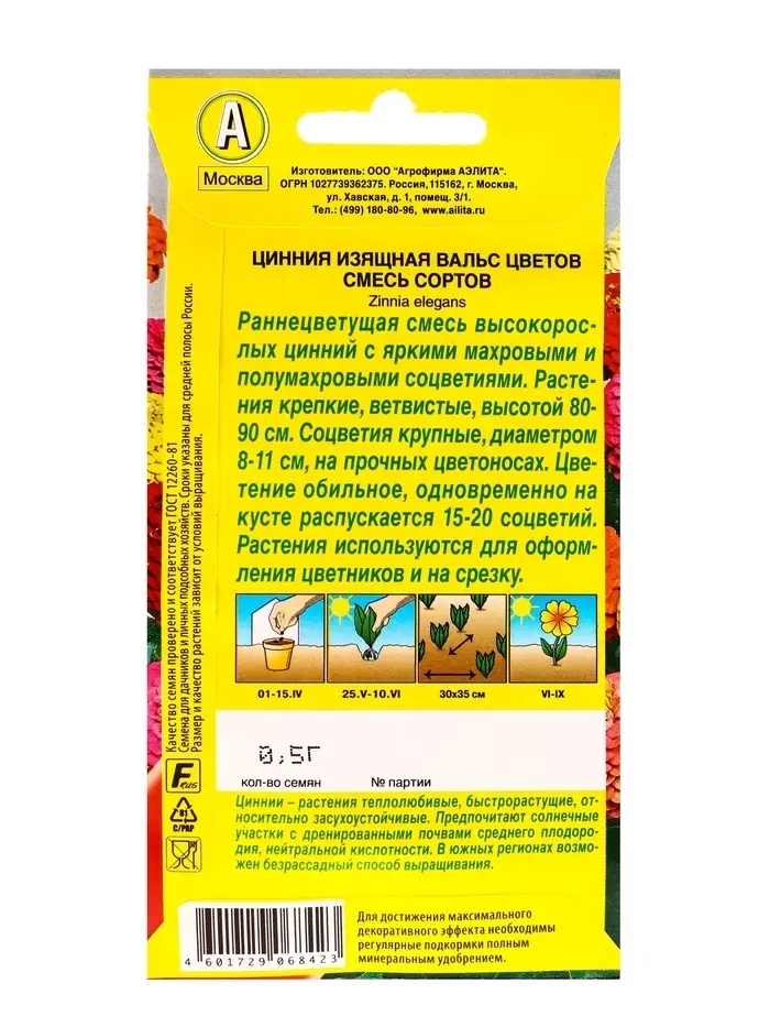 Семена цветов Цинния Вальс цветов, смесь сортов , Ц/П х2,0,5 г