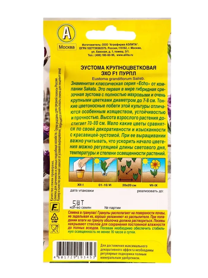 Семена цветов Эустома Эхо F1 пурпл крупноцветковая (драже в пробирке) С. Sakata, Ц/П,5 шт.