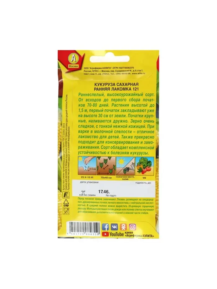 Набор семян Кукуруза сахарная "Ранняя лакомка 121", 5 шт.