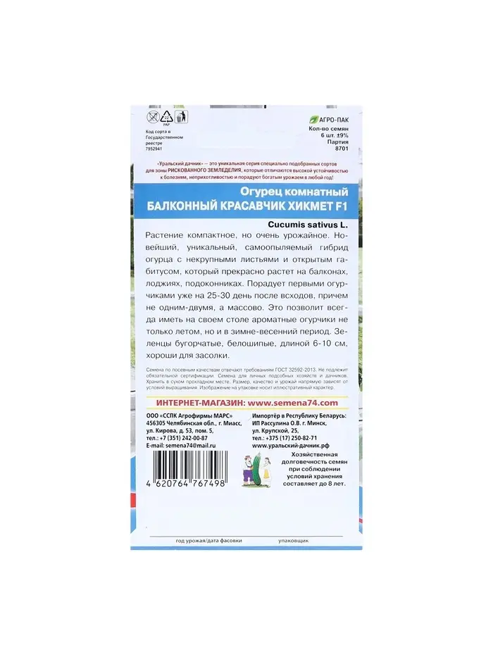 Набор семян Огурец "Красавчик Хикмет", для балконов и подоконников, F1, 4 шт.