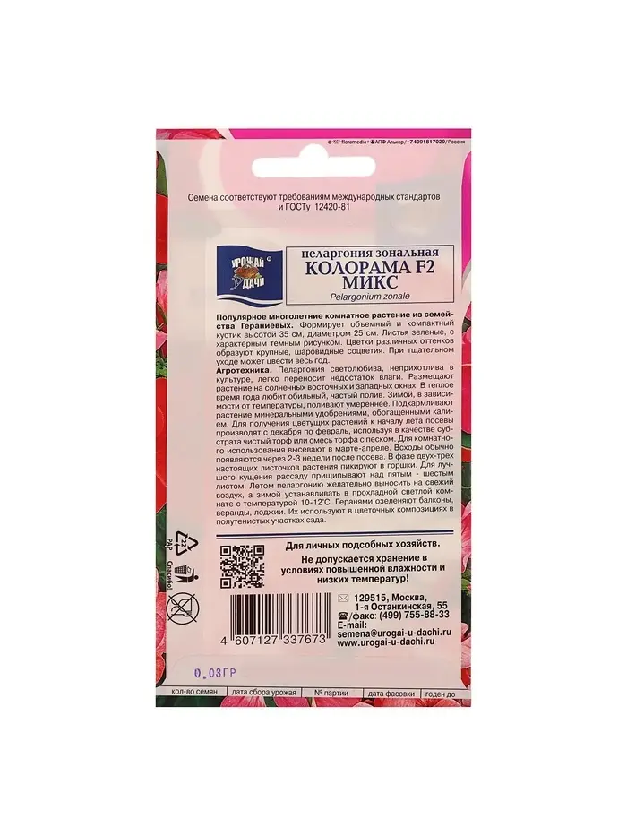Набор семян Пеларгония "Колорама ", смесь окрасок,0,02 гр., 4 шт.