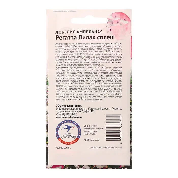 Лобелии серии Regatta давно признаны одними из лучших среди ампельных лобелий. Они сочетают супер-раннее, обильное и продолжительное цветение с большим разнообразием окрасок. Растение сначала формирует ветвистый кустик высотой 15-20 см, затем - ниспадающие побеги до 36 см длиной. Цветки одиночные, до 2 см в диаметре, лилово-белого цвета. В период цветения растение густо усыпано цветами, создавая густой, пушистый, яркий каскад. Лобелия широко используется для аранжировки балконов, подвесных кашпо, а также в контейнерной культуре и вертикальном озеленении. Агротехника: Дражированные семена! В одном драже находится 5-7 семян. Посев проводят с конца февраля по апрель. Драже располагают по поверхности уплотненного и хорошо увлажненного субстрата, не присыпая. Для прорастания семян необходимо яркое освещение и температура воздуха 21-24°С. Ящики сверху прикрывают стеклом, чтобы субстрат был постоянно влажным. Всходы появляются на 4-7 день после посева. Полив проводят из опрыскивателя. Пикировку начинают через 4-5 недель от появления всходов, пучками. На постоянное место растения высаживают в мае-июне, когда минует угроза заморозков, по схеме 20×20 см.После первой волны цветения растения подрезают на высоту 5-7 см, подкармливают, рыхлят почву. Через некоторое время начинается вторая волна цветения, которая длится до заморозков. Штрих-код - 4660010778632