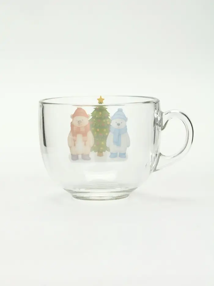 Кружка «Мишки в лесу» — это зимний лес, умещённый в прозрачное стекло. На фоне чистой поверхности — два мишки у ёлки: живые, чуть неуклюжие, с мягкими контурами и тёплыми тенями. Никаких надписей, никаких дат. Только сцена — тихая, как первый снег, и такая же настоящая.