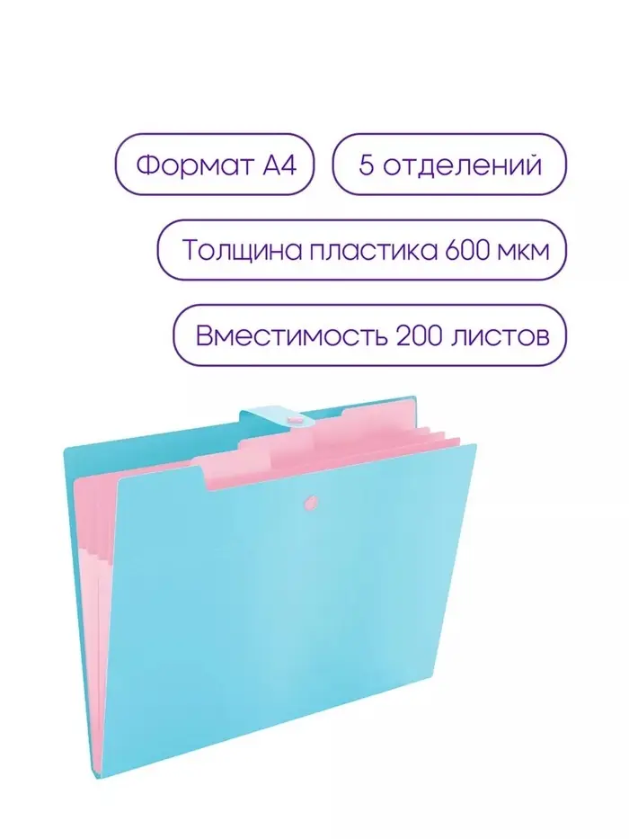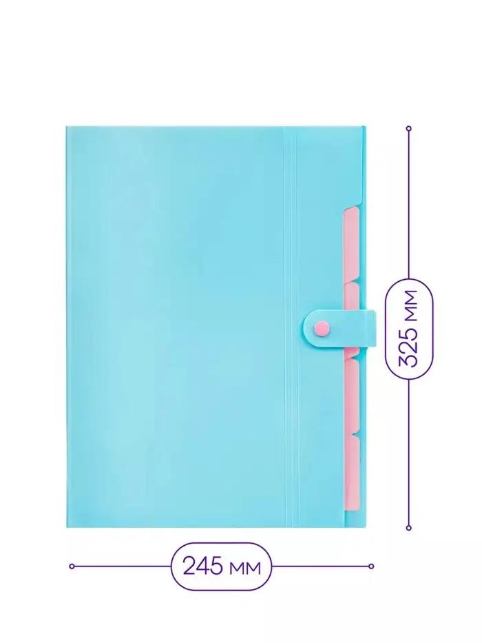 Папка пластиковая на кнопке с отделениями Calligrata формата А4. Обложка матовая, фактура «песок». Цвет обложки - голубой. Пять внутренних отделений для удобного хранения и организации документов. Каждое отделение с индексным полем, позволяет сортировать документы по темам или алфавиту. Надежная застежка-кнопка. Контрастный красный цвет отделений. Быстрый доступ к содержимому. Изготовлена из высококачественного полипропилена с матовой текстурой. Предназначена для хранения и транспортировки документов. Толщина обложки 600мкм. Вмещает до 200 листов. Размер 245*325*10. Упакована в индивидуальный прозрачный пакет по форме.