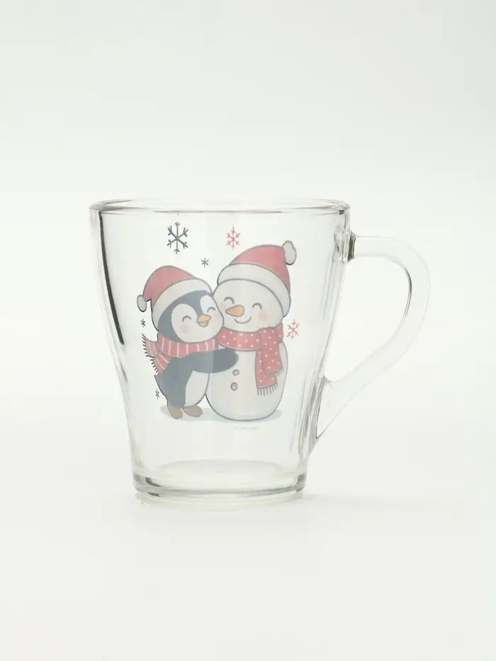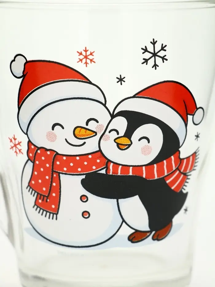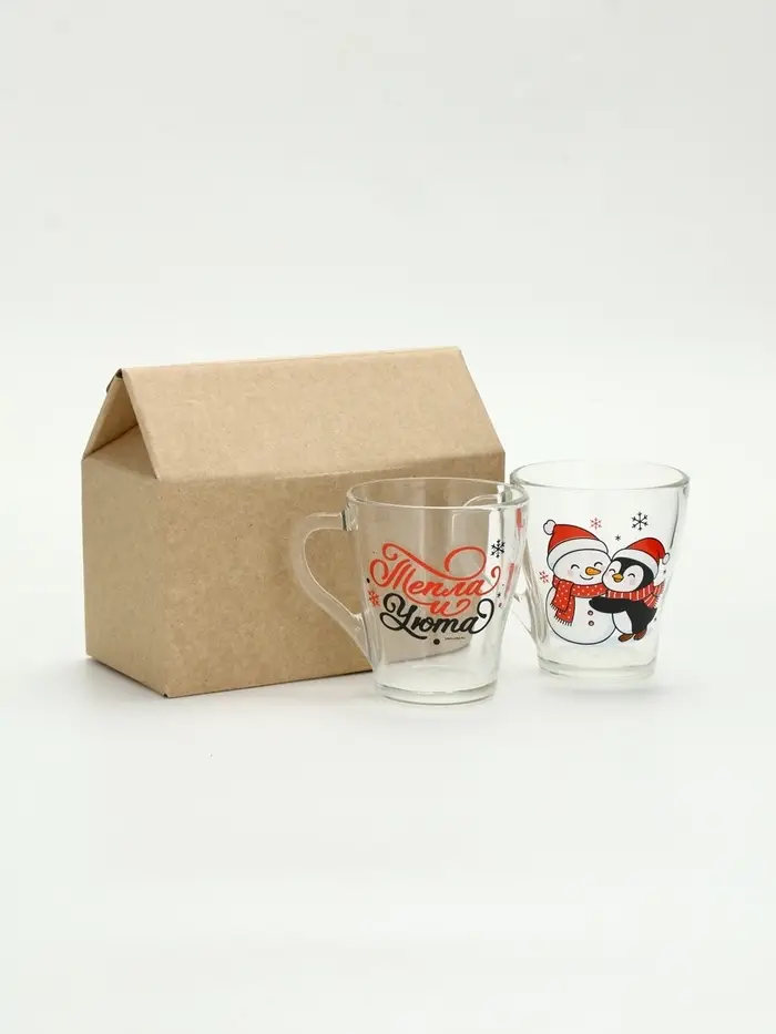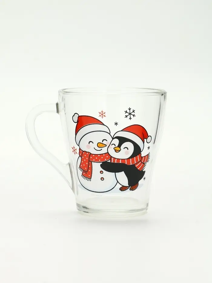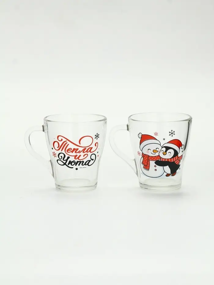 Набор кружек «Персонажи» — это тихий дуэт зимнего уюта, заключённый в прозрачное стекло. Две кружки — два героя одного вечера: на первой — пингвин, обнимающий снеговика, будто знает, что даже из снега можно сложить нечто тёплое; на второй — только фраза: ”Тепла и уюта”, без восклицаний, без пафоса, как шёпот перед сном. Никаких символов года, никаких дат — только момент, в котором хватает места для смеха, тишины и пары над какао.