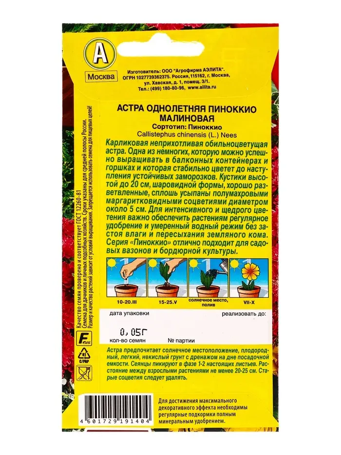 Семена цветов Астра Пиноккио малиновая Цветущий балкон, Ц/П,0,05 г