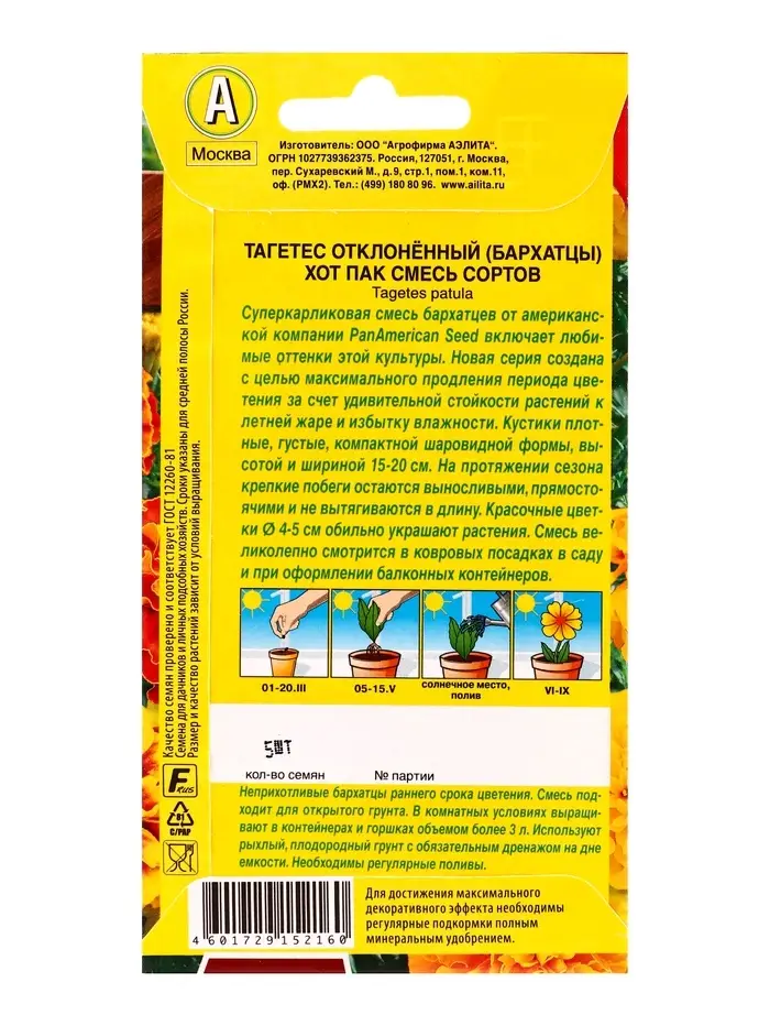Семена цветов Бархатцы Хот пак, смесь сортов Цветущий балкон, Ц/П,5 шт.