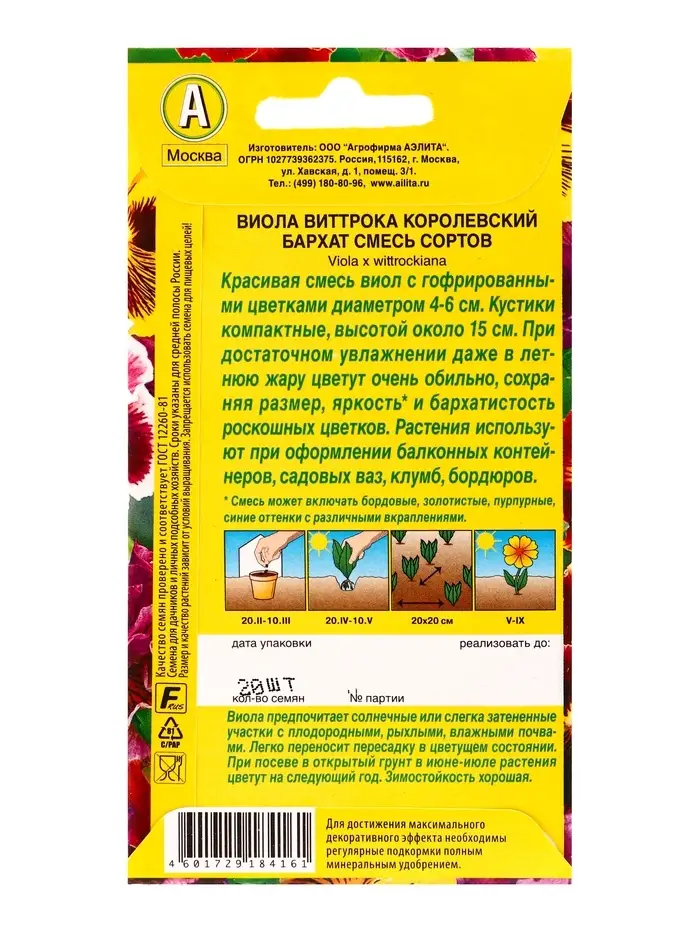 Семена цветов Виола Королевский бархат, смесь сортов Дв, Ц/П,20 шт.