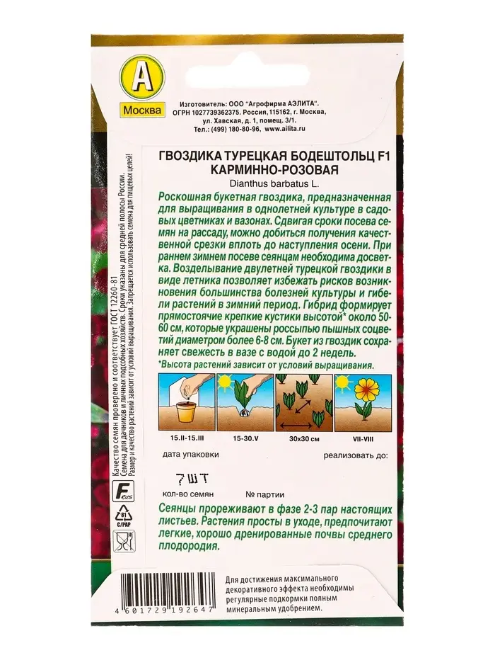 Семена цветов Гвоздика турецкая Бодештольц F1 карминно-розовая Золотая серия, Ц/П,7 шт.