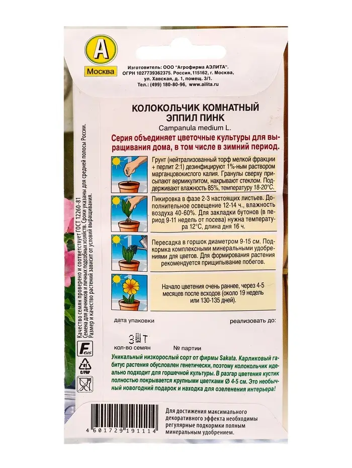 Семена цветов Колокольчик комнатный Эппил пинк (драже) С. Sakata Зимний сад, Ц/П,3 шт.