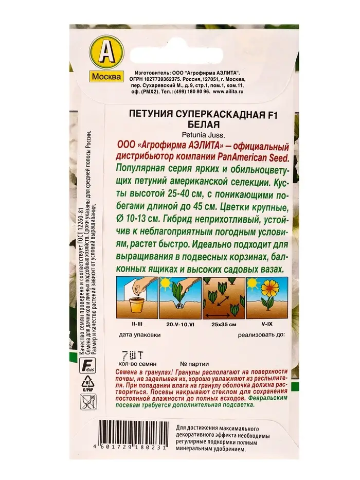 Семена цветов Петуния суперкаскадная F1 белая (драже) PanAmerican, Ц/П,7 шт.