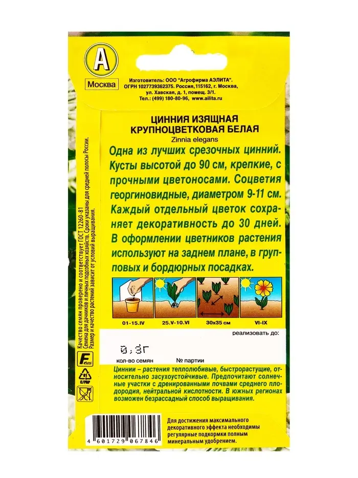 Семена цветов Цинния Крупноцветковая белая , Ц/П,0,3 г