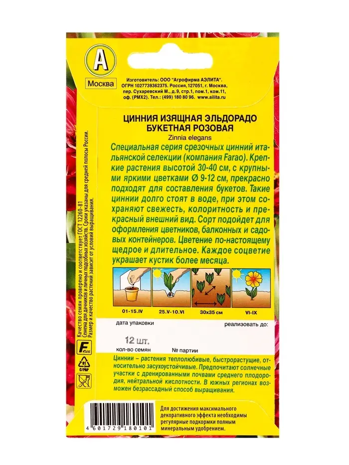 Семена цветов Цинния Эльдорадо букетная розовая С. Farao, Ц/П,12 шт.