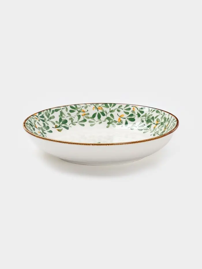 Плоская фарфоровая тарелка «Гармония лепестков» диаметром 18,5 см — изящный выбор для тех, кто предпочитает лёгкую эстетику в повседневной сервировке. Белоснежный фон подчёркивает нежный зелёный растительный орнамент, вдохновлённый природными формами, а компактный размер делает изделие универсальным: от завтрака и десертов до порционных закусок и лёгких обедов. Глазурованная поверхность сохраняет блеск и целостность рисунка даже при ежедневном использовании.