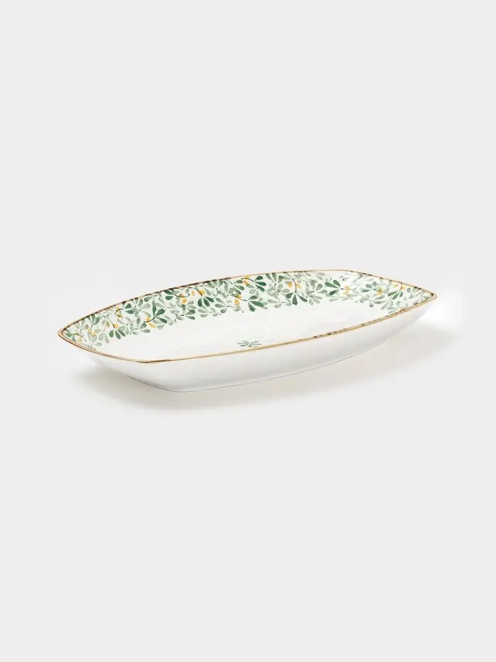 Сервировочное блюдо «Гармония лепестков» — практичное и эстетичное решение для подачи закусок, нарезок или десертов на общий стол. Его вытянутая фигурная форма (30×18 см) и небольшая глубина (3,5 см) создают удобную зону для компоновки блюд, а нежный цветочно-растительный орнамент в бело-зелёной гамме добавляет лёгкую декоративность без излишеств. Фарфор обеспечивает прочность, а глазурованная поверхность сохраняет свежесть рисунка даже при частом использовании.
